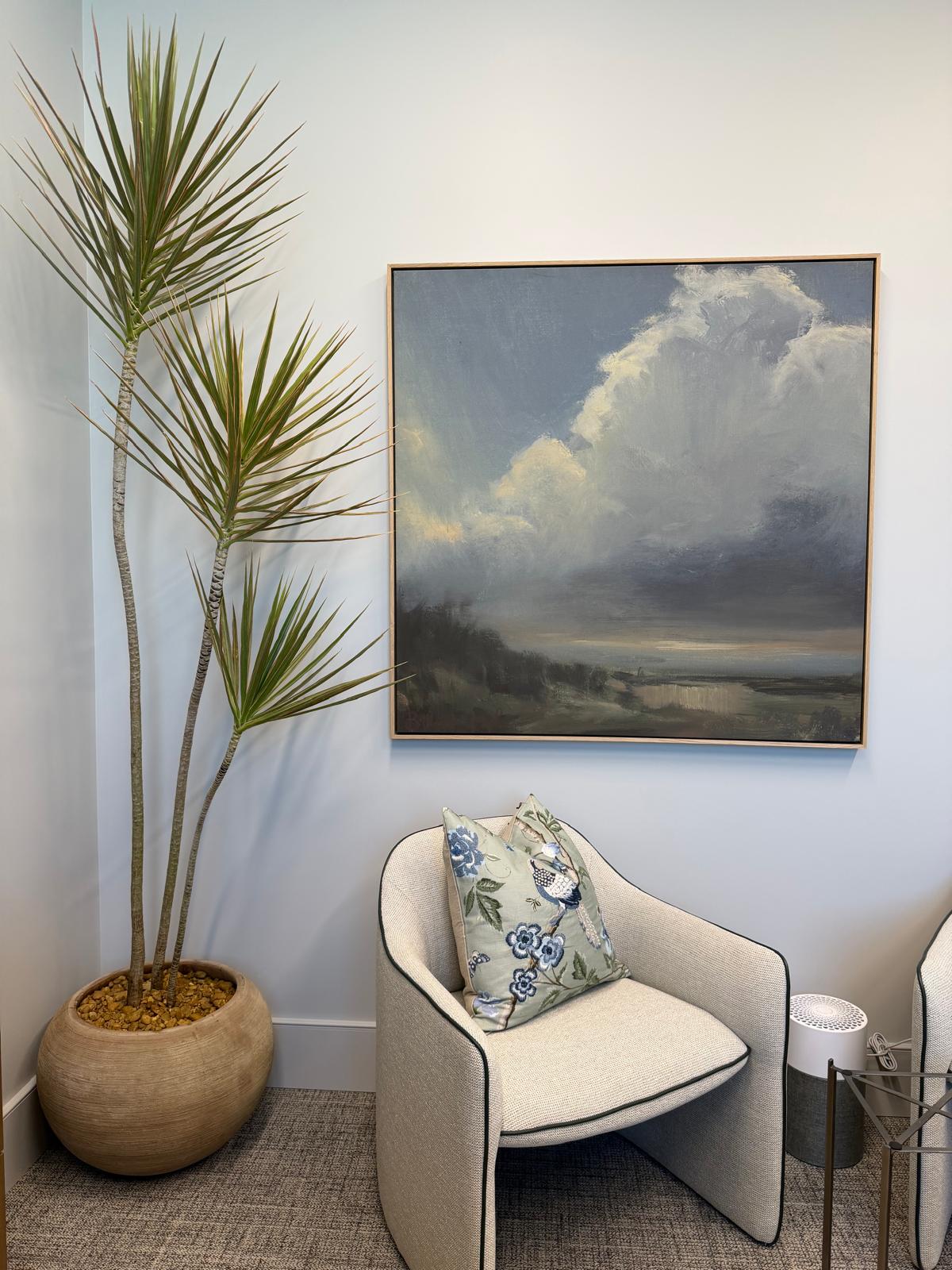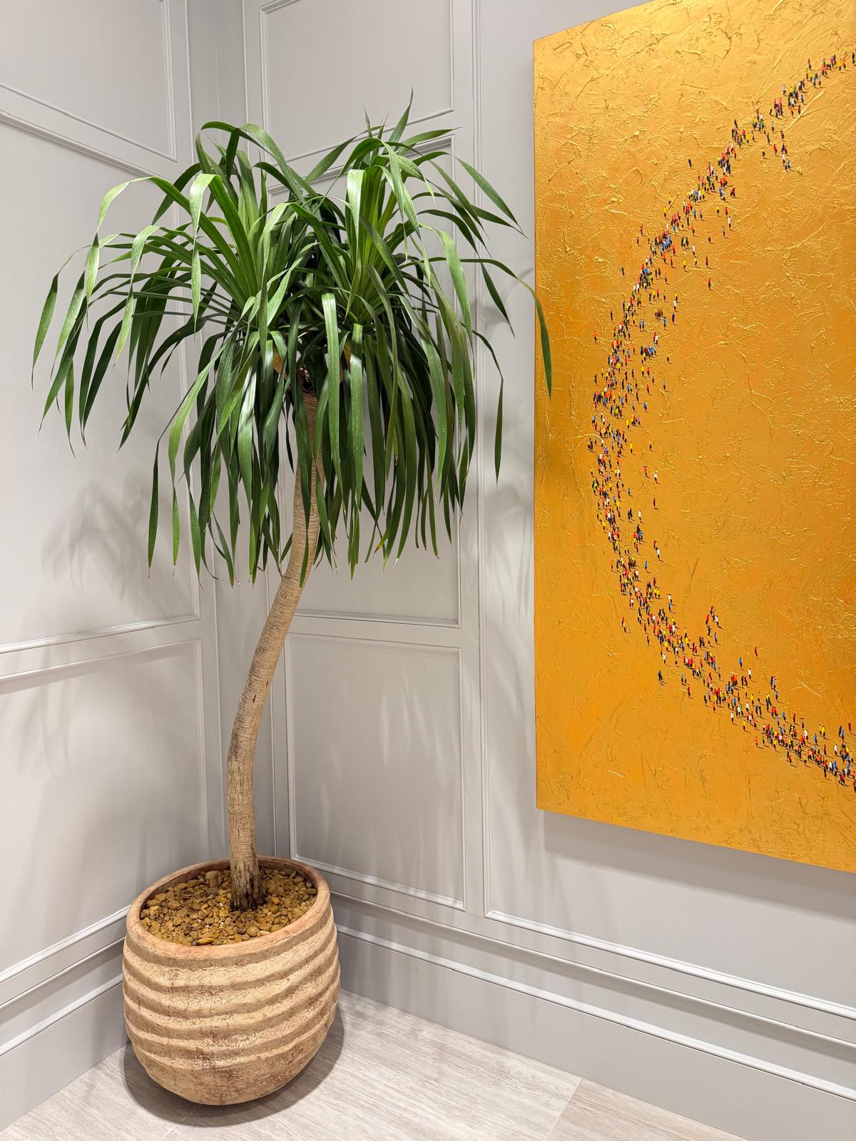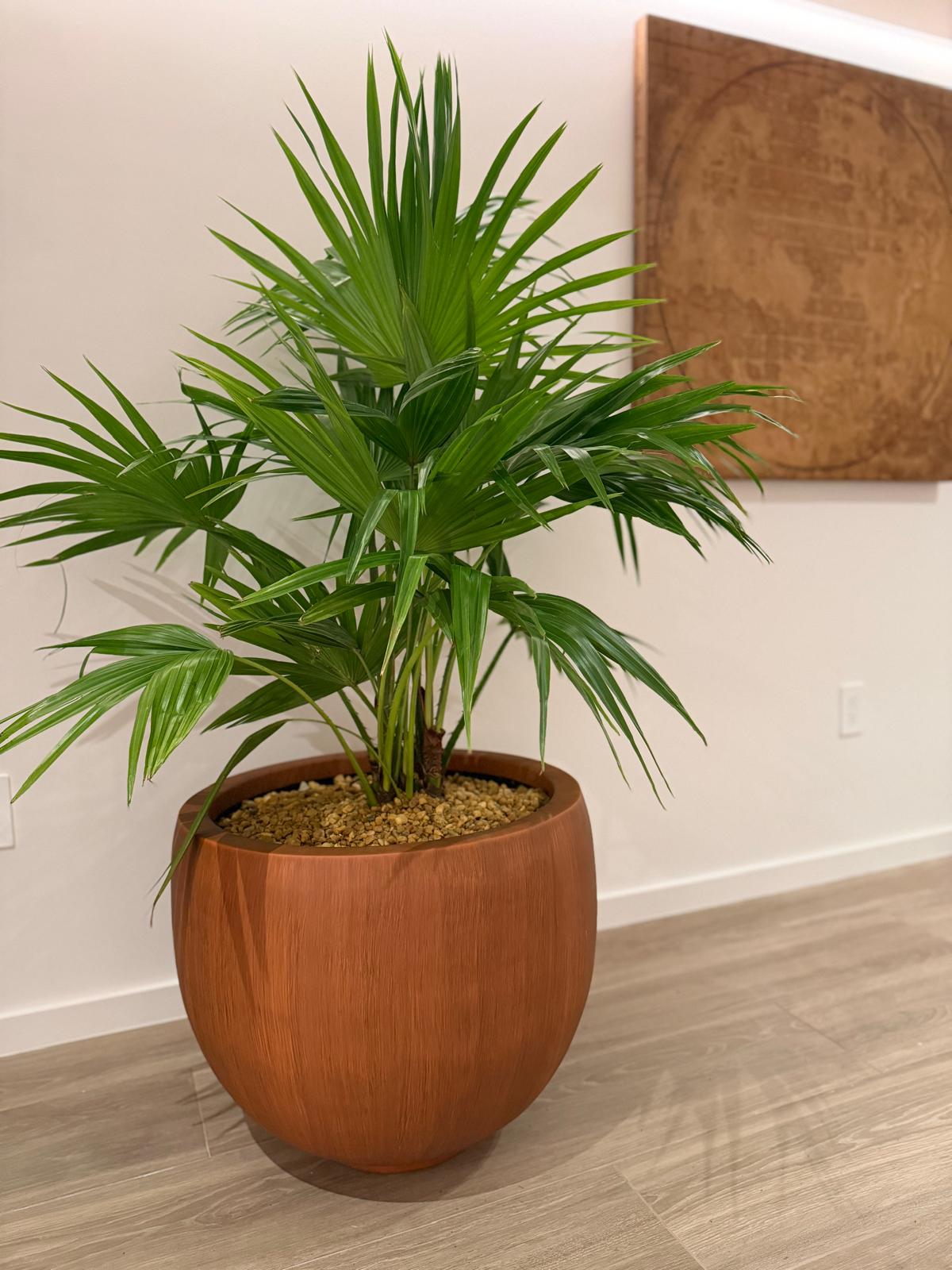 A full, architectural palm styled in a warm toned planter, bringing clean height and a calm, elevated feel to the space.