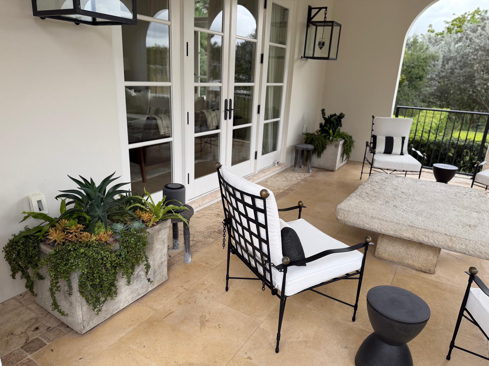 A refined patio setup with a large stone planter and sculptural greenery, placed to complement the furniture and the entry flow.