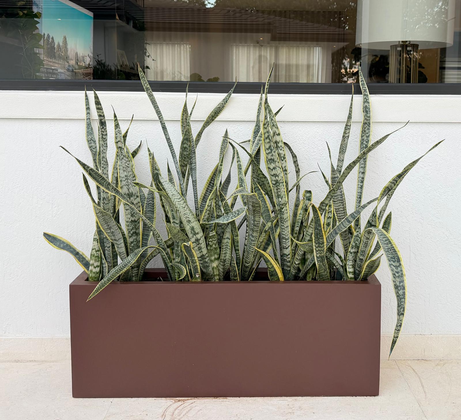 A structured rectangular planter filled with snake plants, creating a crisp, minimal look that feels modern and low maintenance.