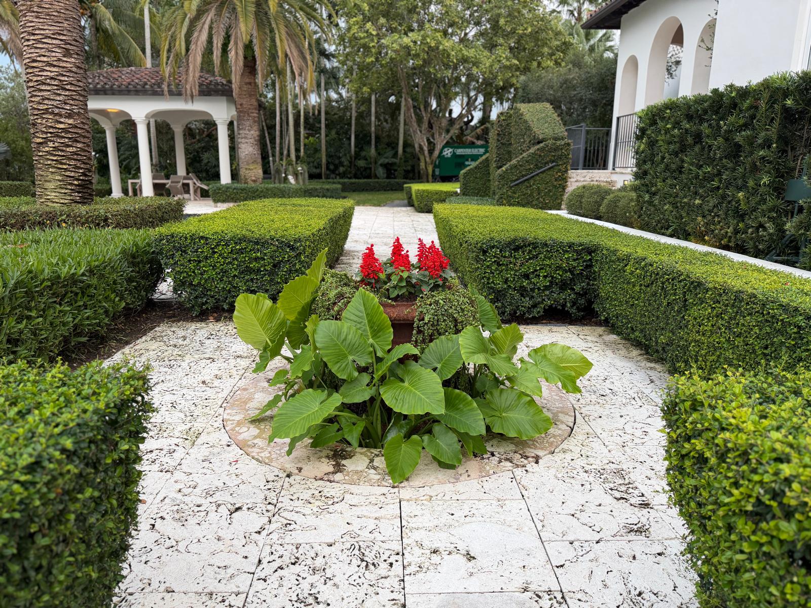 A clean, symmetrical garden walkway framed by manicured hedges, with a tropical focal planting and bright red blooms adding contrast at the center.