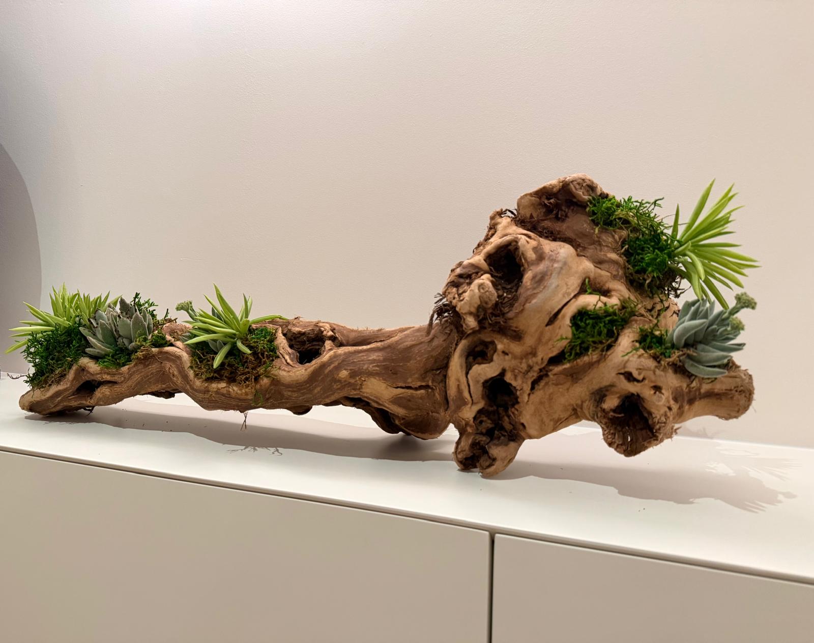 A natural driftwood piece styled with succulents and greenery, combining organic form with a clean, curated finish.