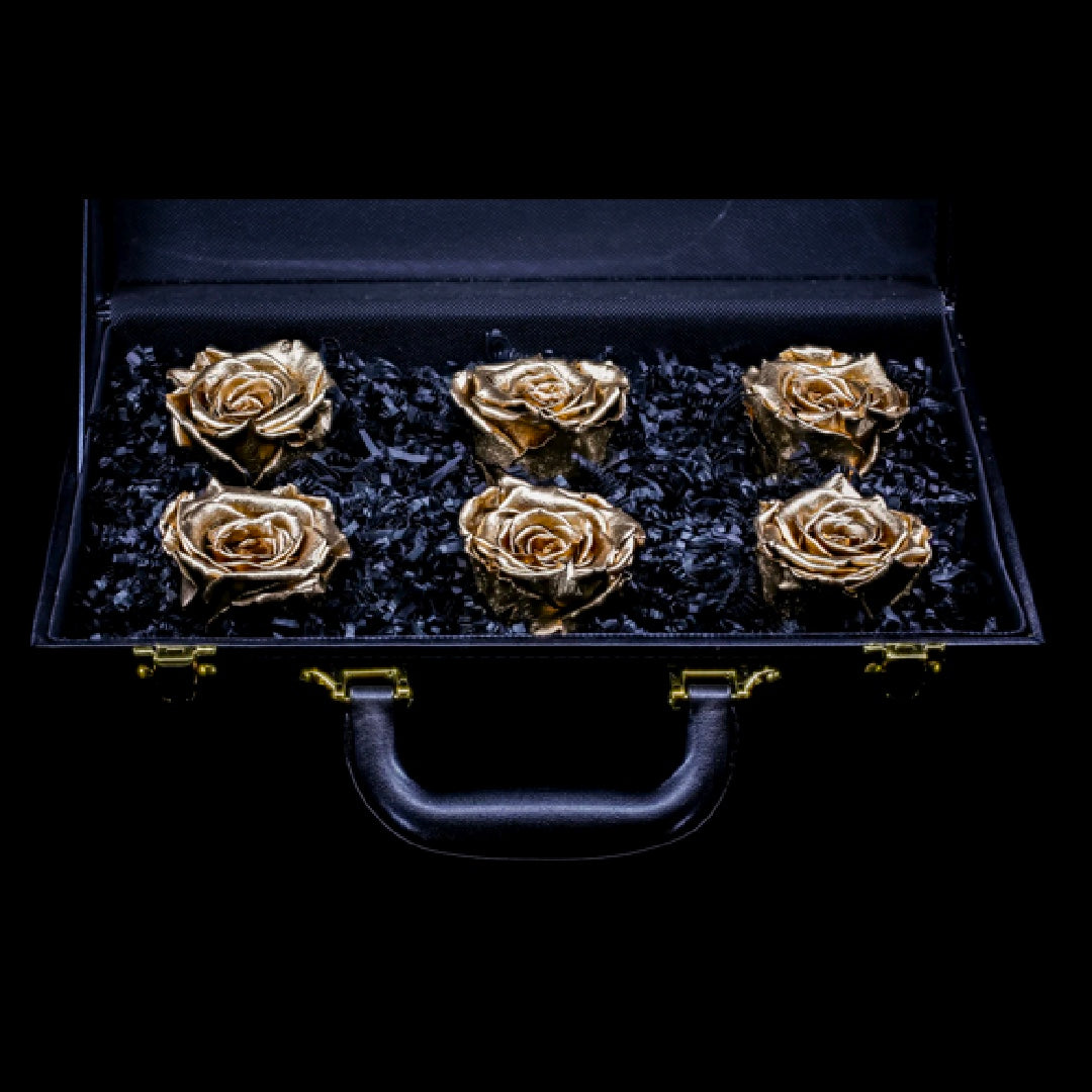 This black leather gift box can be customized with any name or saying. The box does not have design on it unless you choose to customize the box. Gold hardware and a black silk bag. Choose any color flower and amount of flowers. This is a customized gift that is extra special and thoughtful for your gifting experience.