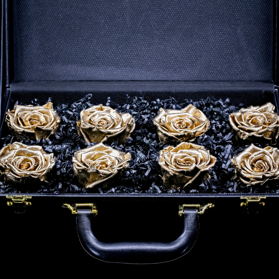 8 Preserved Gold Roses in black leather briefcase with gold hardware and satin ribbon to prop box open. Drink Champs logo is Gold Embossed.