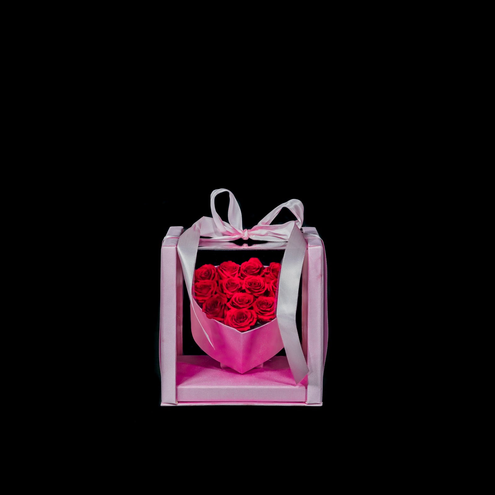 This box comes in two sizes: SMALL & LARGE. Small holds 12 mini preserved roses and Large holds 24 mini Forever Roses. These roses are real and treated to last forever. They do not need water or sunlight.