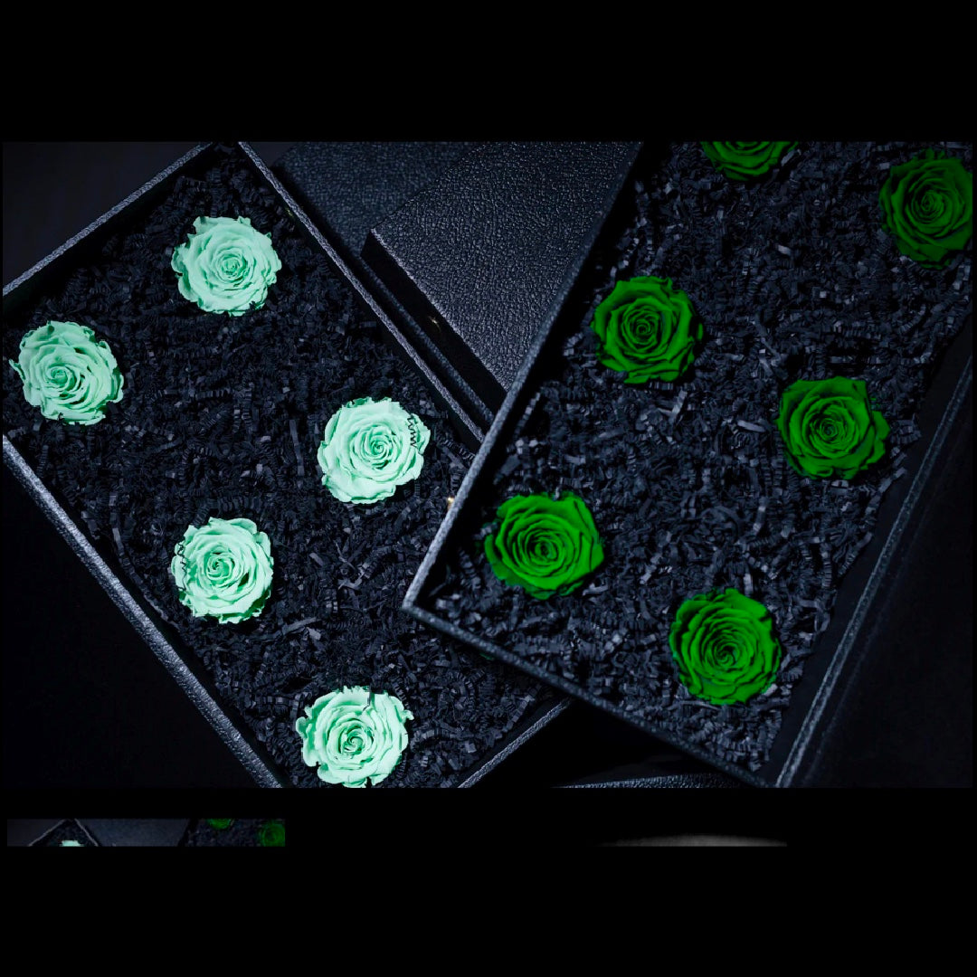 Six green preserved roses in sleek black box with gold fasteners and confetti. Roses are real and treated to last a life time with out water or care. Please keep out of direct sunlight.