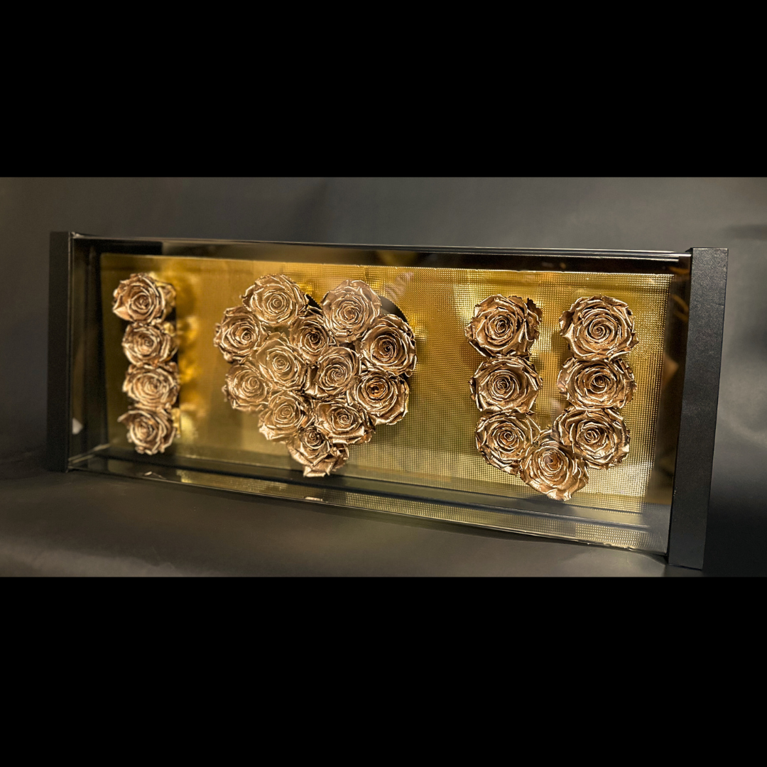 This I LOVE U acrylic window box is perfect for a unique gift. Customize this box with any name or small message. It Holds 23 roses. These roses are real and treated to last a life time. The roses do not need water or sunlight. Please keep out of the sun for color longevity. Box size is 24" long by 4" tall.