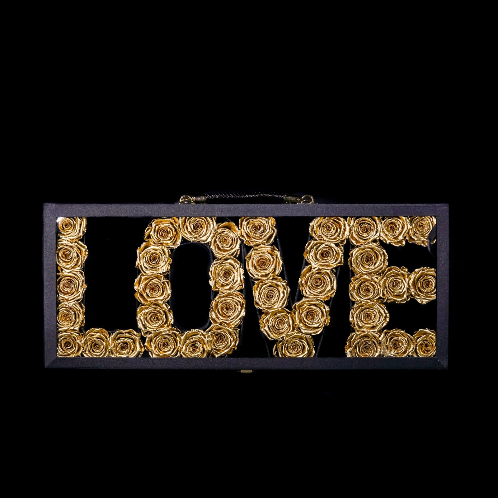 This window box holds 38 real preserved roses. It is made with black satin material and has gold hardware with a luxury handle. Size of the box is 24" long. The roses are real and treated to last a life time. They do not need water or sun. Please keep out of Direct sunlight for color longevity. Customize the box with a name or saying.